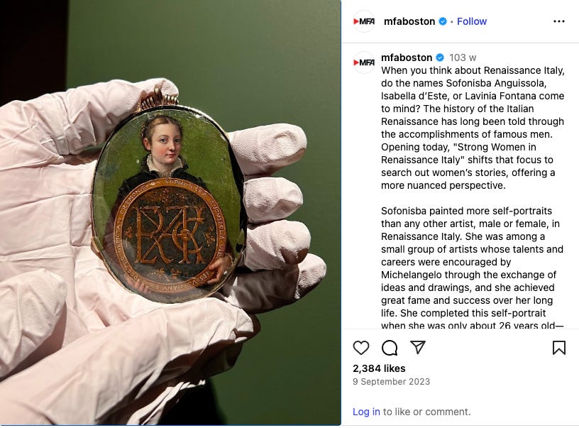 So just how small is Sofonisba’s MFA miniature self-portrait? Well, pretty darned small indeed, as can be seen by this photo from their instagram account promoting their 2023 show, Strong Women in Renaissance Italy.