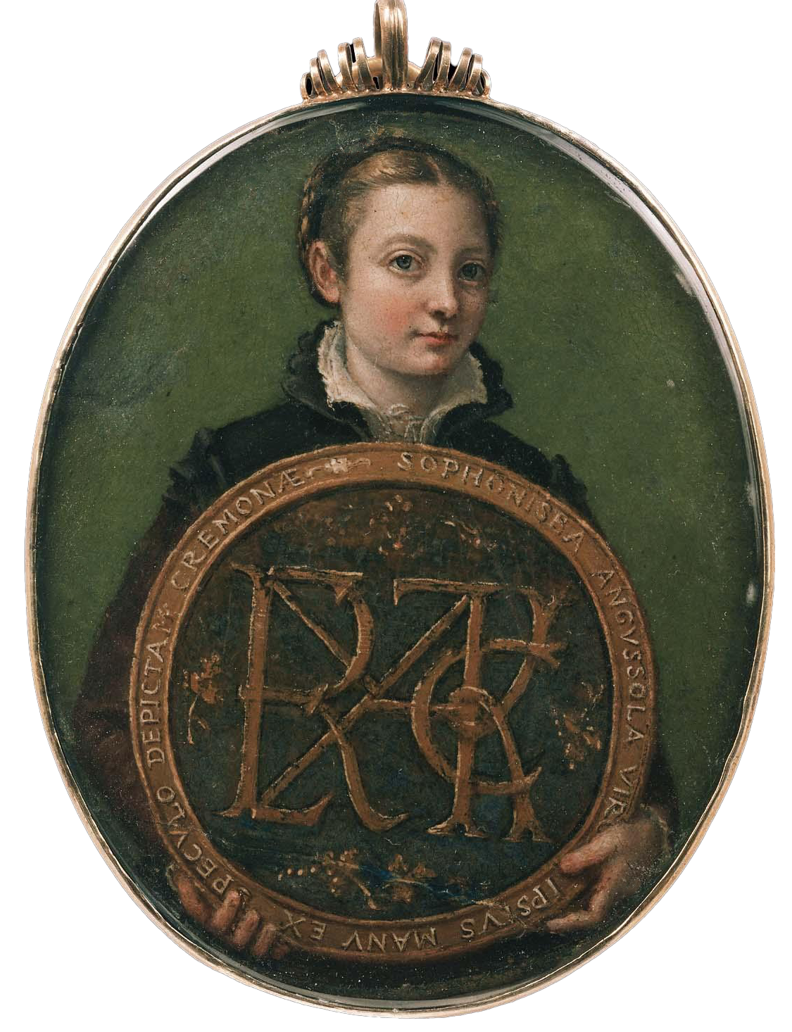 A clue, of sorts, can be found in the Latin text that runs around the outer circumference: “SOPHONISBA ANGVSSOLA VIRGO IPSIVS MANV EX SPECVLO DEPICTA CREMONAE” – By the maiden Sophonisba Anguissola, depicted from the mirror, in her own hand, in Cremona.