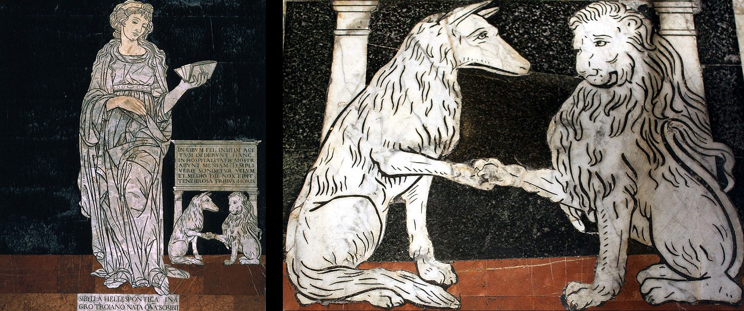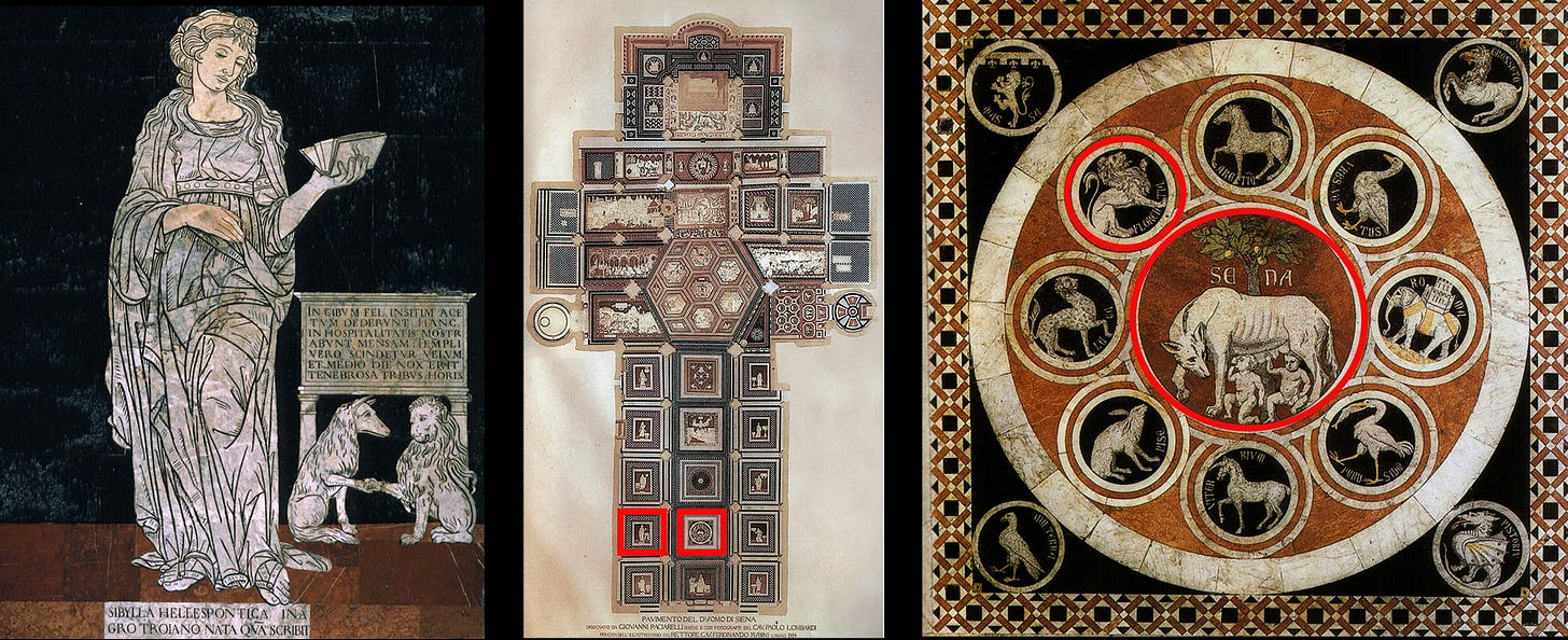 And then – most significantly of all – it must be recognized that there’s another marble floor mosaic directly adjacent to the Hellespontine Sibyl, where the iconic Sienese wolf and Florentine Lion (among others) are explicitly referenced.